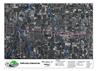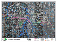 After multiple meetings with the Community Advisory Groups (CAG), Regional Advisory Group (RAG), and a Project Study Group (PSG), a range of Alternatives were developed. These groups were given the opportunity to brainstorm potential corridors and draw their ideas on aerial maps. The potential corridors were then evaluated by the project team for possible fatal flaws, such as impacting Special Lands, State Parks, Natural Area Sites, or Threatened and Endangered Species. If any of these areas were impacted, the corridor was eliminated. Remaining corridors moved on to the Screening and Consolidation step and can be seen in the exhibits below: